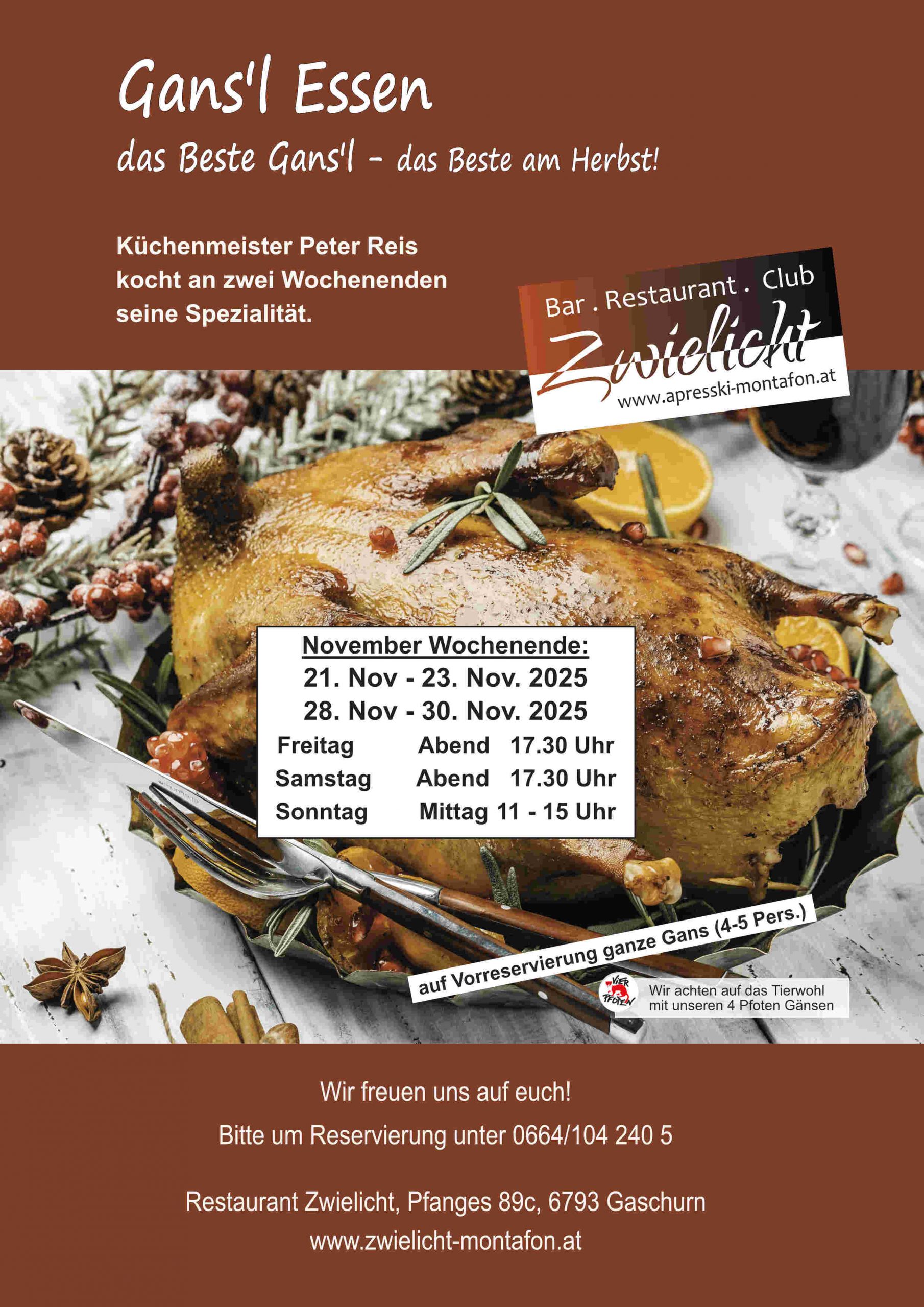 Der Herbst hat viele schöne Seiten – aber eine der köstlichsten findet man garantiert in Gaschurn: Das legendäre Gansl-Essen im Restaurant Zwielicht! Küchenmeister Peter Reis zaubert an zwei ausgewählten November-Wochenenden eine kulinarische Spezialität, die Feinschmecker-Herzen höherschlagen lässt.